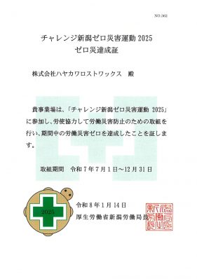 当社は「チャレンジ新潟ゼロ災害運動2025」に参加し、 労使協力のもと安全活動を進めた結果、 運動期間中の労働災害ゼロを達成し、表彰をいただきました。 今後も社員一人ひとりが安心して働ける職場づくりを継続し、 安全最優先の企業として努力を続けてまいります。
